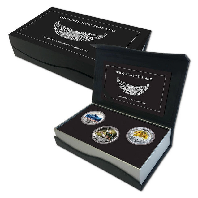 Set di 3 monete Discover New Zealand 3 x 1 oncia d'argento 2022 Proof
