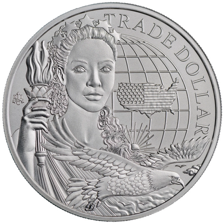 Il rovescio della moneta raffigura la personificazione della dea della libertà e una rappresentazione geografica del territorio degli Stati Uniti. Sul rovescio è presente anche la scritta “TRADE DOLLAR” .