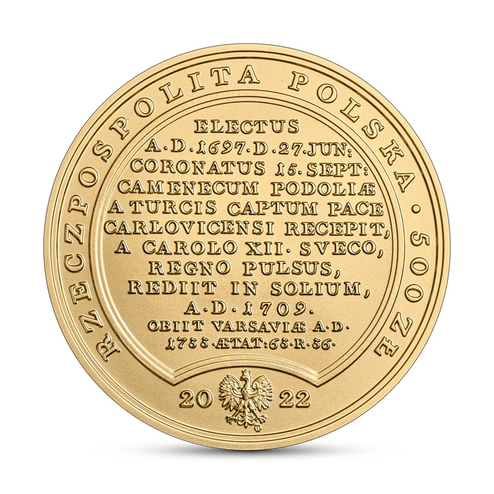 La moneta d'oro Augusto II il Forte è stata coniata nel 2022 in oro Au.9999, con un peso di 62,2 grammi e un diametro di 45 mm. Questo prodotto da collezione ha una tiratura strettamente limitata a soli 600 esemplari. Inoltre, la moneta è stata protetta in un cappuccio dedicato e il tutto viene consegnato in un astuccio di legno con allegato un certificato di autenticità. Ogni moneta è accompagnata da una cartellina.