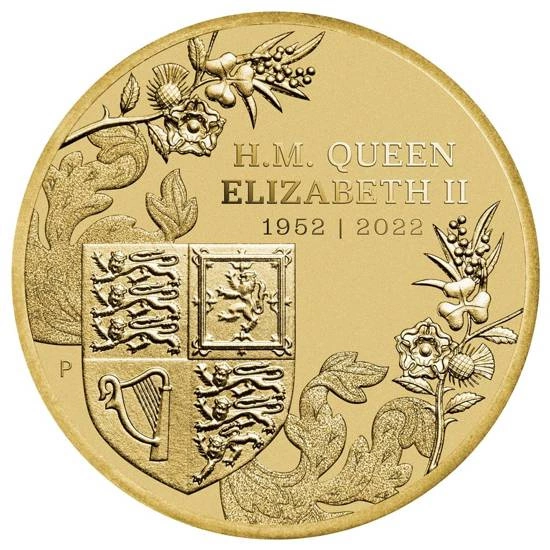 Il rovescio della moneta presenta la scritta “H.M. QUEEN ELIZABETH II”, “1952-2022”.