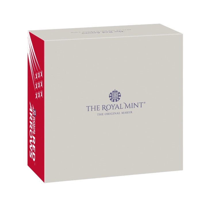 Il rovescio raffigura tre aerei Hawk T1 Red Arrows in volo con scie di fumo nei caratteristici colori rosso, bianco e blu. Il disegno celebra il 60° anniversario della prima esibizione dei Red Arrows nel 1965. La moneta reca la scritta “RED ARROWS”. La moneta è stata disegnata da Nigel Tudman della Tuch Design,