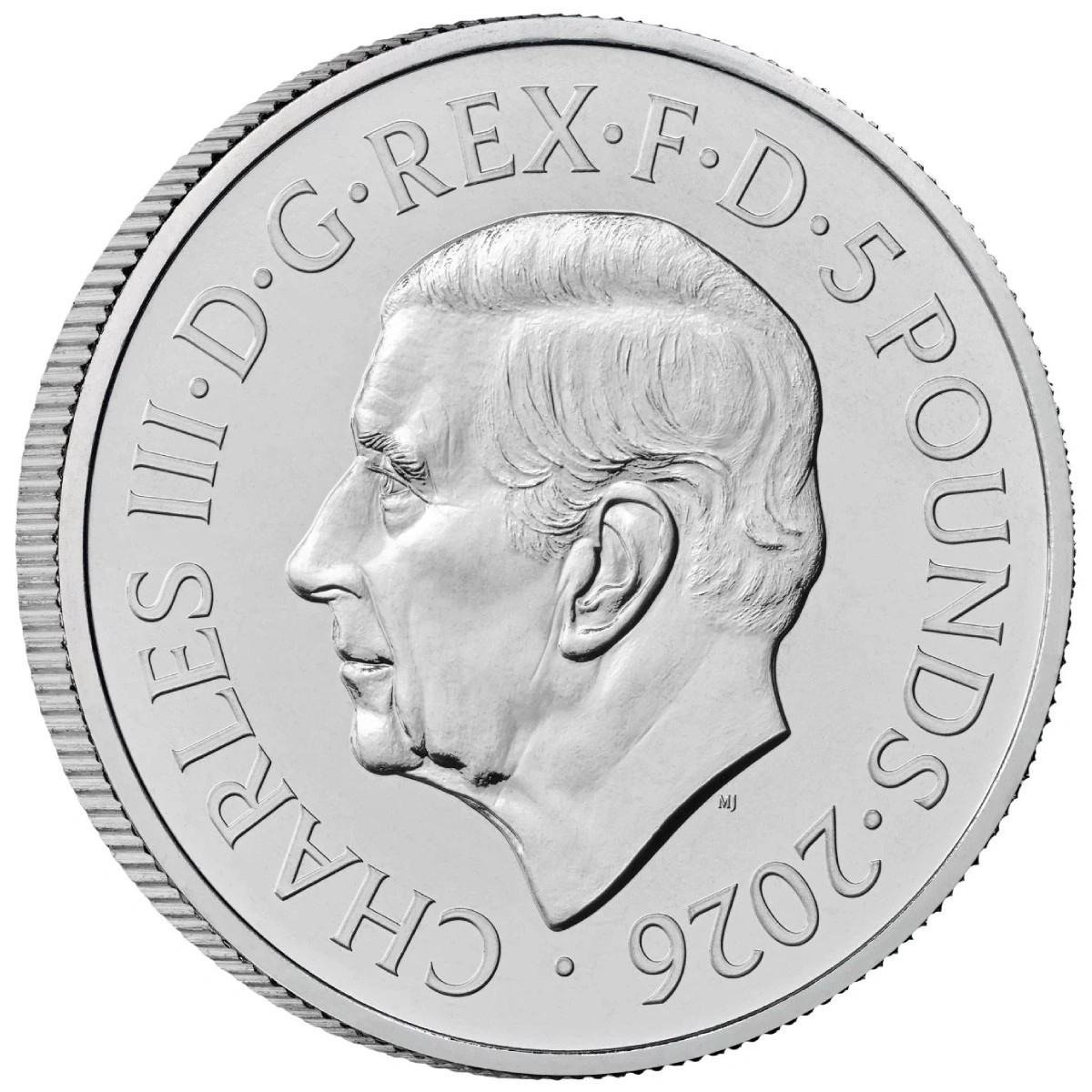 Dritto: presenta il ritratto ufficiale di re Carlo III realizzato da Martin Jennings, insieme al valore nominale £5 e all'anno di emissione 2026, in linea con il canone attuale delle monete britanniche circolanti e da collezione.