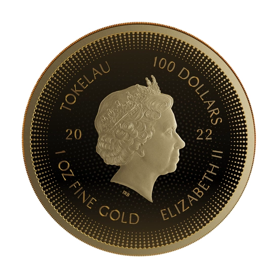 Il dritto della moneta d'oro raffigura il ritratto della regina Elisabetta II e le informazioni relative alla data di emissione, al peso, al valore nominale e al paese di emissione.