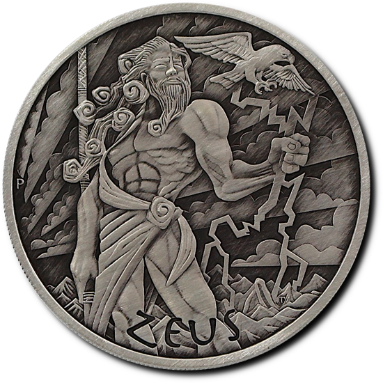 Srebrna moneta ukazująca najwyższego greckiego boga, Zeusa to kolekcjonerski produkt wykonany z czystego kruszcu próby 9999, o wadze jednej uncji trojańskiej. Moneta ta posiada wykończenie „Antiqued Finish”, co sprawia, iż całość nabiera „starożytny’’ charakter. Co więcej, srebrny Zeus posiada gwarancję rządu Tuvalu oraz stanowi pełnoprawny środek płatności na terenie tego kraju. Jego nakład liczy jedynie 1 500 sztuk.