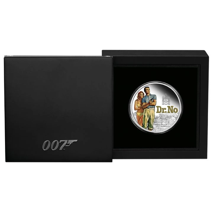 Il rovescio della moneta d'argento raffigura l'agente 007 e Honey Ryder a colori e la scritta “DR. NO”.