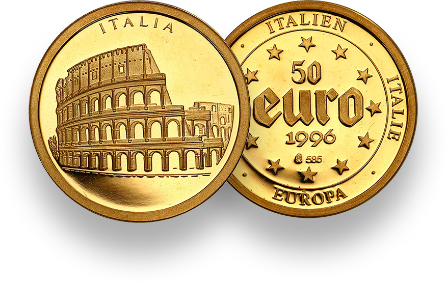 Włochy przedstawiają na złotych monetach euro zabytki architektury starożytnej, jak w przypadku monety 50 euro z wizerunkiem koloseum.