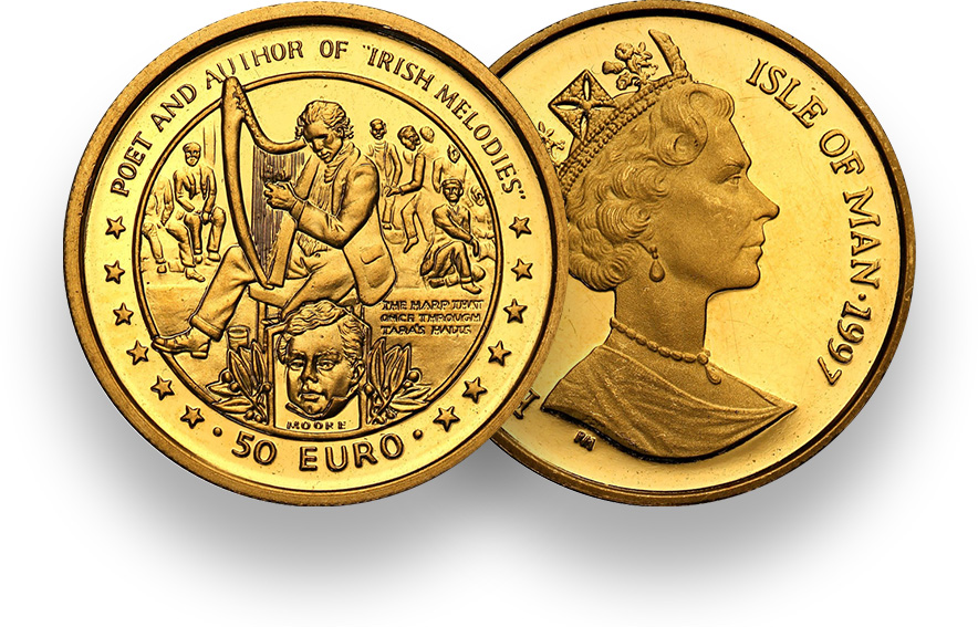 Do ciekawostek z zakresu emisji złotych monet z wybitnymi postaciami można zaliczyć walor 50 euro z Thomasem Moorem, pochodzącym z wyspy Man. Wyspa Man jest częścią wysp brytyjskich, a Wielka Brytania jak powszechnie wiadomo, nie jest strefie euro. Wyspa leży w archipelagu wsyp brytyjskich, lecz jako terytorium nie jest częścią Wielkiej Brytanii. Nie była też częścią Unii Europejskiej przed Brexitem. Obywatele tej wyspy mogą jednak korzystać z części praw przyznanych na mocy obywatelstwa Unii Europejskiej. Wyspa posiada więc sporą autonomię, dzięki czemu może wybijać walory w kruszcu takim jak złoto, w nominale euro.