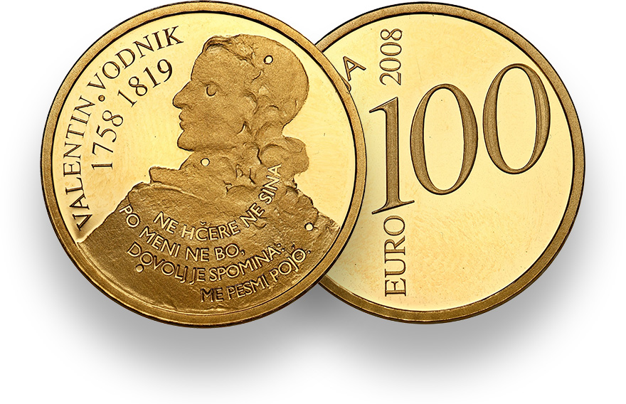 Słowenia bije złote monety z Valentinem Vodnikiem, poetą, duchownym i nauczycielem, który przyjmował aktywną postawę w okresie późnego oświecenia.