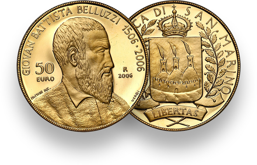 San Marino jest malutkim państwem leżącym na terytorium Włoch, które również bije własne złote monety euro. Do najbardziej znanych należą walory z serii Battista Belluzzi, wybijane dla uczczenia włoskiego architekta, znanego między innymi z zaprojektowania fortyfikacji Florencji, Pizy i oczywiście San Marino.