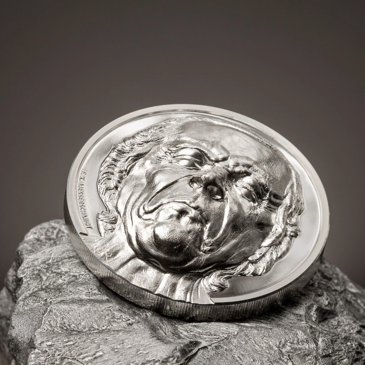 Cook Islands: Striking Heads - The Vexed Man 2 uncje Srebra 2023 Proof Ultra High Relief to niezwykle ciekawy egzemplarz, który został wykonany z wielką dbałością o każdy szczegół. Moneta prezentuje "The Vexed Man", czyli urzekające alabastrowe popiersie wyrzeźbione przez niemieckiego artystę Franza Xavera Messerschmidta, wykonane pod koniec XVIII wieku.