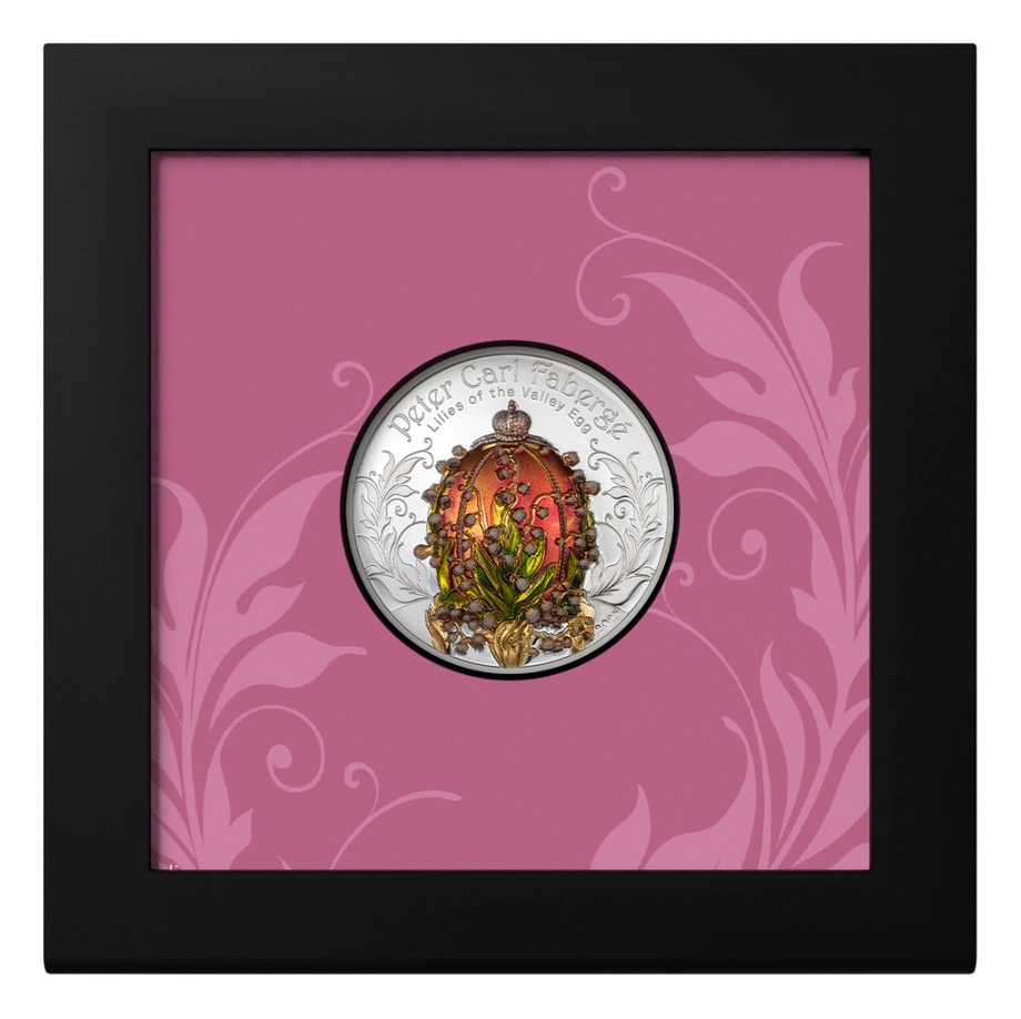 Srebrna moneta kolekcjonerska Mongolia: Peter Carl Fabergé - Lilies of the Valley Egg kolorowany 2 uncje Srebra 2025 Proof High Relief to kolejny niezwykły egzemplarz z serii "Peter Carl Fabergé", który zachwyca precyzją wykonania i artystycznym kunsztem. Moneta przedstawia jedno z najsłynniejszych jaj Fabergé, "Lilies of the Valley Egg", zaprojektowane w 1898 roku dla carycy Aleksandry Fiodorowny, żony cara Mikołaja II.