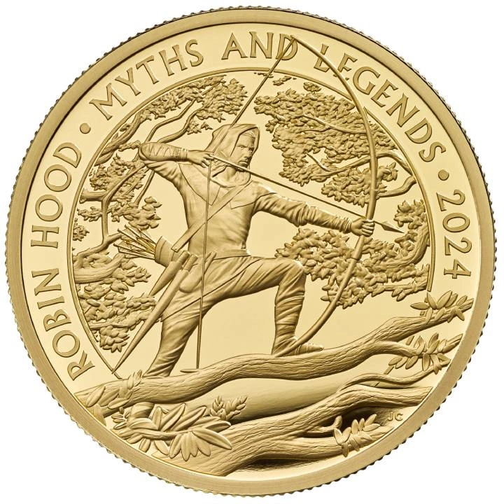 Złota moneta Myths & Legends: Robin Hood 1 uncja Złota 2024 Proof prezentuje jedną z postaci legend arturiańskich, niezliczonej liczby legend, dzieł literackich i filmów. Od epoki wiktoriańskiej po literaturę amerykańską XIX i XX wieku jest powszechnie przedstawiana jako łotrzyk od dobrym sercu z lasu Sherwood.