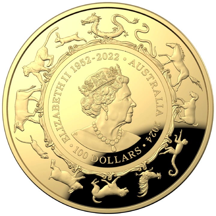 Awers monety zdobi podobizna Królowej Elżbiety II, projektu Jody’iego Clark’a. Całość otacza napis „ELIZABETH II” , „AUSTRALIA”, a także 12 zwierząt z chińskiego kalendarza lunarnego. Na awersie znajduje się informacja o wartości nominalnej i roku wybicia waloru.