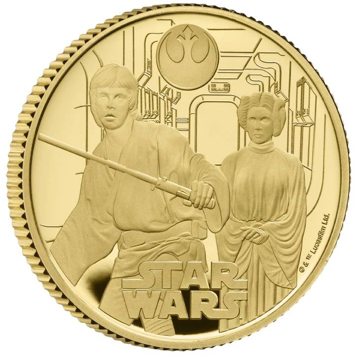 Star Wars: Luke Skywalker and Princess Leia 1/4 uncji Złota 2023 Proof to trzecia moneta z serii "Star Wars". Walor jest numizmatycznym unikatem dla fanów ikonicznej sagi kosmicznej. Gwiezdne Wojny to fikcyjne uniwersum stworzone przez George'a Lucasa. Pierwszy film miał premierę w 1977 roku. Produkt prezentuje Luke'a Skywalker'a i Księżniczkę Leia'ę - dwie kluczowe postacie, które odgrywają kluczową rolę w sadze Star Wars.
