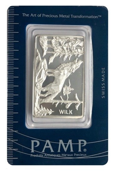 Srebrna sztabka z wizerunkiem wilka to okaz o wadze jednej uncji srebra oraz próbie Ag 999. Ten wyjątkowy walor pochodzi od światowego producenta metali szlachetnych jakim jest Produits Artistiques Metaux Precieux (PAMP).