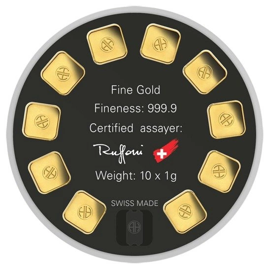 Złote sztabki to najstarsza i najpopularniejsza forma lokowania kapitału. Prezentowany produkt posiada, aż 10 złotych sztabek. Każda z nich posiada wagę 1 grama oraz zawartość kruszcu wynoszącego 99.99%. Prezentacyjne opakowanie w którym znajdują się sztabki stanowi idealne zabezpieczenie oraz podkreśla wyjątkowość całego produktu. Warto dodać, iż producentem MultiDisc'u jest renomowana mennica Argor Heraeus.