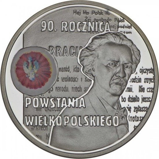 Moneta upamiętniająca 90 rocznicę Powstania Wielkopolskiego, wykonana z srebra o próbie 925 oraz masie 14,14 g. Powstanie wielkopolskie toczące się przeciwko Rzeszy Niemieckiej na przełomie lat 1918-1919 miało na celu odzyskanie ziem zaboru pruskiego. Powstanie zakończyło się 16 lutego 1919 roku rozejmem w Trewirze, który rozszerzał na front powstańczy zasady rozejmu w Compiègne z 11 listopada 1918 kończącego I wojnę światową.