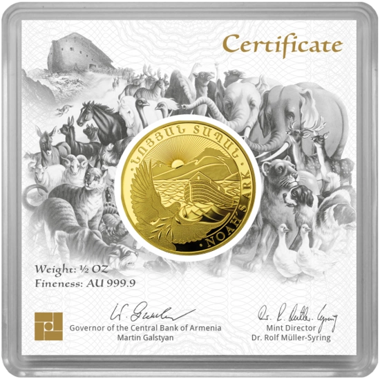 Złota moneta Arka Noego to popularny produkt inwestycyjny, wybity w wadzę 1/2 uncji oraz czystości kruszcu 9999. Ten ciekawy walor jest emitowany przez Centralnego Bank Armenii. Jednakże sam proces produkcyjny odbywa się w prywatnej, niemieckiej mennicy - Leipziger Edelmetall Verarbeitung. Monety z wizerunkiem arki posiadają gwarancję rządu Republiki Armenii co do ich legalności, czystości próby oraz pochodzenia kruszcu, a także są pełnoprawnym środkiem płatniczym na terenie tego kraju.