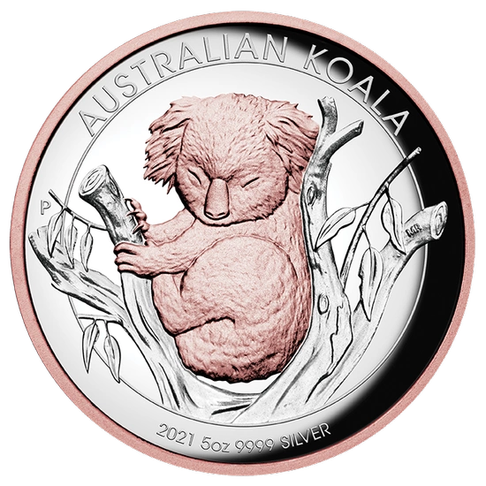 Kolekcjonerska moneta Australijska Koala 5 uncji Srebra 2021 Proof High Relief Pozłacana to unikatowy produkt przygotowany z myślą o wymagających kupcach. Ten wyjątkowy walor bity jest stemplem lustrzanym, a całość została wzbogacona wysokim reliefem. Dodatkowo moneta pozłacana jest 22-karatowym różowym złotem.