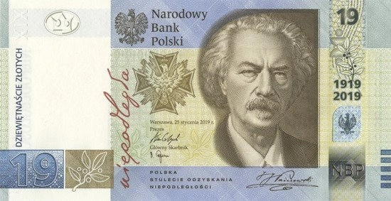 Należy zauważyć, iż projekt banknotu zawiera bezpośrednie nawiązania do setnej rocznicy oraz symboli, które były użyte przy tworzeniu pierwszych banknotów dla Rzeczpospolitej Polskiej. Pierwszym z takich symboli jest wartość nominalna – 19 złotych – nawiązuje ona do daty utworzenia przez Jana Paderewskiego PWPW, czyli roku 1919. Kolejnym jest postać samego Jana Paderewskiego, a także znak wodny, który przedstawia wizerunek orła. Taki projekt orła znajdował się na pierwszym wyprodukowanym w roku 1920 banknocie. Poza wymienionymi szczegółami, na banknocie można odnaleźć jeszcze kilka jubileuszowych symboli.