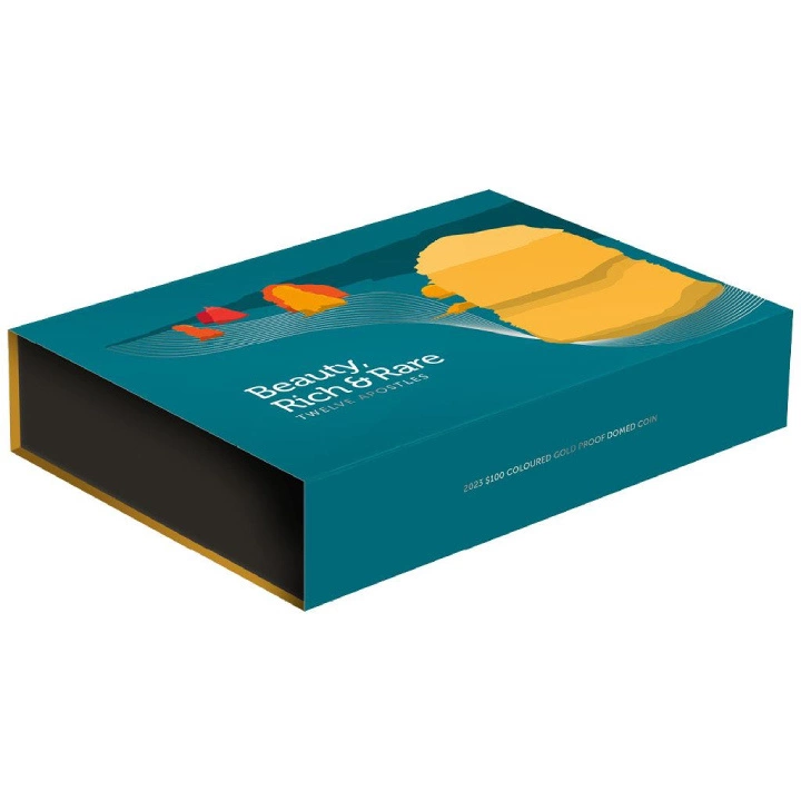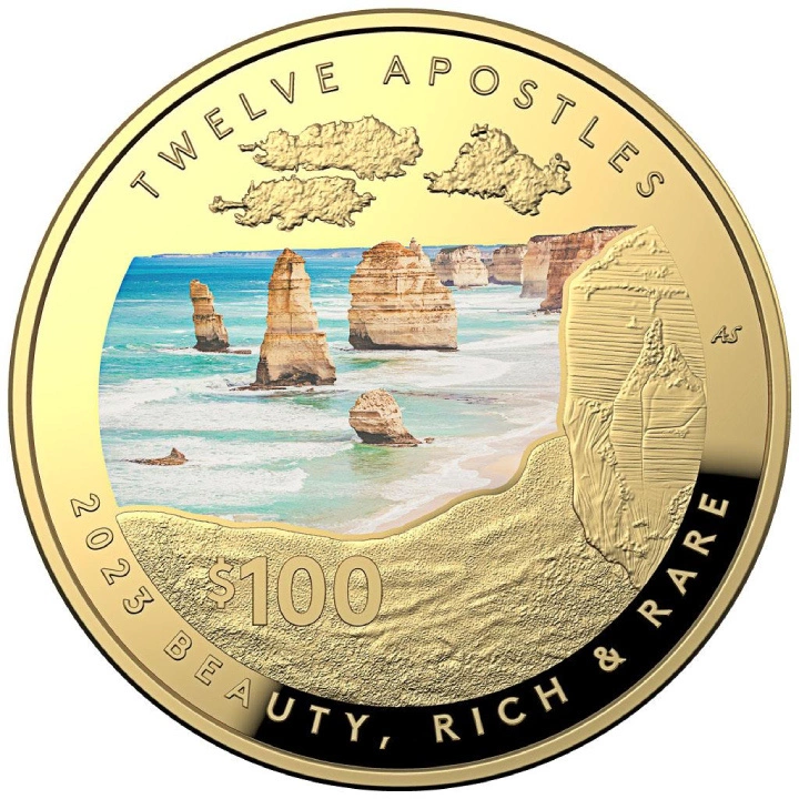 Beauty, Rich & Rare: Twelve Apostles kolorowany 1 uncja Złota 2023 Proof Domed Coin, to trzecia i ostatnia moneta z serii "Beauty, Rich and Rare". Walor prezentuje "Dwunastu Apostołów" - skały, które są grupą naturalnie powstałych kolumn z wapienia, tuż przy brzegu w parku narodowym Port Campbell w stanie Wiktoria w Australii.
