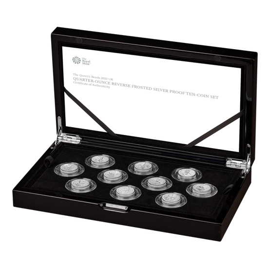 Bestie Królowej: Bestie Królowej: Zestaw 10 monet 1/4 uncji Srebra 2021 Proof to unikatowy zestaw srebrnych monet przygotowany przez renomowaną mennicę The Royal Mint. Zestaw jest szczególnie polecany kolekcjonerom, chcącym poszerzyć swoje portfolio o unikatową kolekcję monet z serii Bestie Królowej. Cała seria skupia się wokół dziesięciu heraldycznych Bestii, których celem była ochronna wstępującego na tron monarchy. Monety z roku 2021 są bite w standardzie proof z czystego srebra próby Ag.999, o wadze 1/4 uncji trojańskiej oraz o średnicy 22 mm.