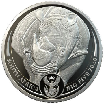 Awers ukazuje głowę nosoroża oraz napis "SOUTH AFRICA", "BIG FIVE 2020" i herb RPA.