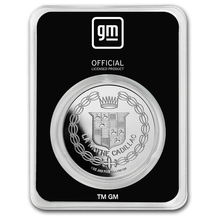Moneta Cadillac "La Mothe Cadillac" Logo 1 uncja Srebra to walor prezentujący logo marki Cadillac w latach 1902 oraz 1925. Marka Cadillac należy do amerykańskiego koncernu motoryzacyjnego General Motors. Cadillac produkuje samochody luksusowe, wysokiej klasy od 1902 roku.