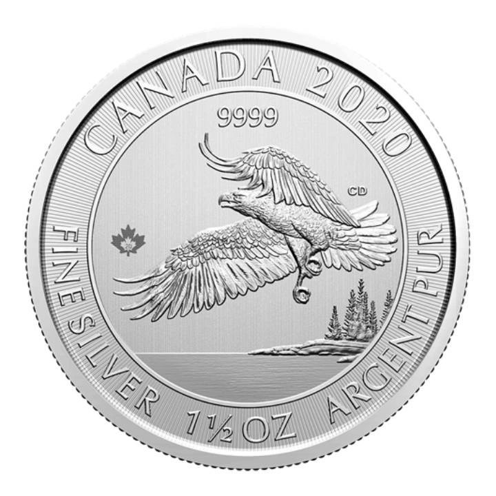 Rewers monety ukazuje majestatycznego orła bielika w locie, tuż nad wodą. Orzeł, z szeroko rozpostartymi skrzydłami, jest symbolem siły i niezależności. W tle można dostrzec elementy kanadyjskiej przyrody, a także inskrypcję „2020 1.5oz 9999 FINE SILVER”. Moneta jest doskonałym przykładem kunsztu menniczego, który łączy piękno przyrody z precyzyjnym wykonaniem.