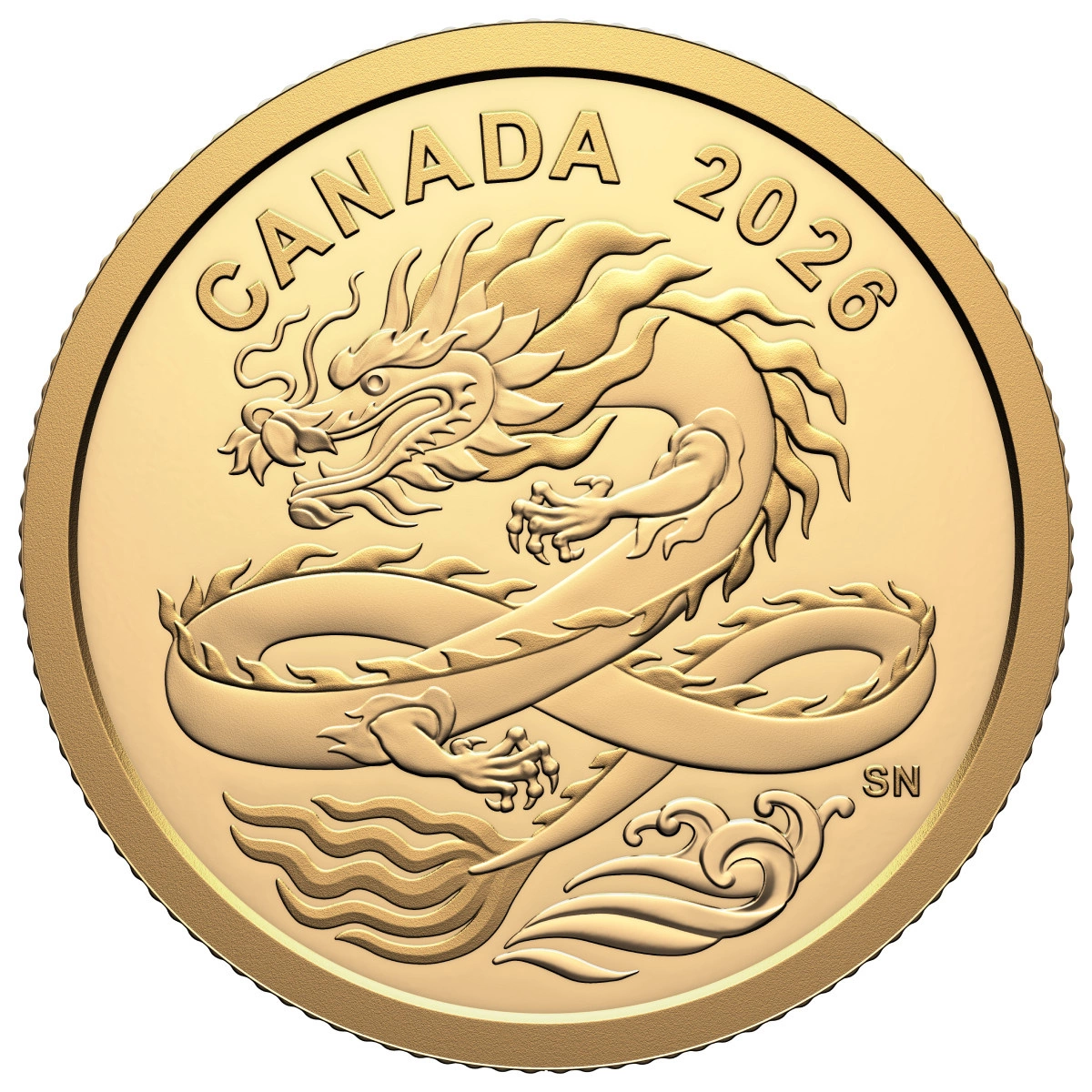 Rewers ukazuje wysoce szczegółowego smoka autorstwa Simona Nga, symbol mocy, siły i szczęścia z ciałem w kształcie cyfry 8, otoczony falami dobrobytu i radości, z napisem CANADA oraz rokiem emisji 2026.