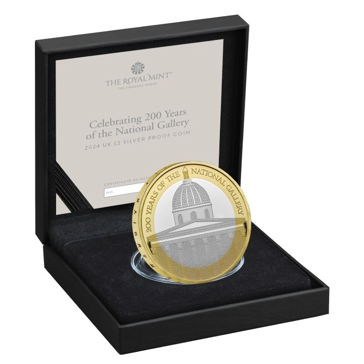 Celebrating 200 Years of the National Gallery £2 pozłacany Srebro 2024 Proof upamiętnia 200. rocznicę National Gallery w Londynie. Galeria Narodowa to jeden z najważniejszych i najbardziej prestiżowych muzeów sztuki na świecie. Znajduje się w centrum Londynu, przy Trafalgar Square, i posiada bogatą kolekcję dzieł sztuki europejskiej, w tym malarstwa, rzeźby, grafiki i fotografii, sięgającą od średniowiecza do współczesności. Galeria została założona w 1824 roku i od tego czasu jest dostępna dla publiczności, promując sztukę jako dziedzictwo narodowe. Jej zbiory obejmują dzieła takich mistrzów jak Leonardo da Vinci, Vincent van Gogh, Rembrandt.