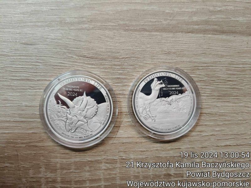 Congo: Prehistoric Life II - Suchomimus 1 uncja Srebra 2024 to inwestycyjna moneta, która jest drugą odsłoną pochodzącą z drugiej serii Prehistoric Life. Walor przedstawia dinozaura teropoda, który żył około 112 milionów lat temu, w okresie wczesnej kredy. Był to stosunkowo duży dinozaur, osiągający długość do 11 metrów i ważący około 3-5 ton. Suchomimus wyróżniał się długim, wąskim pyskiem, przypominającym krokodyla, co sugeruje, że mógł być przystosowany do chwytania ryb, podobnie jak współczesne krokodyle.