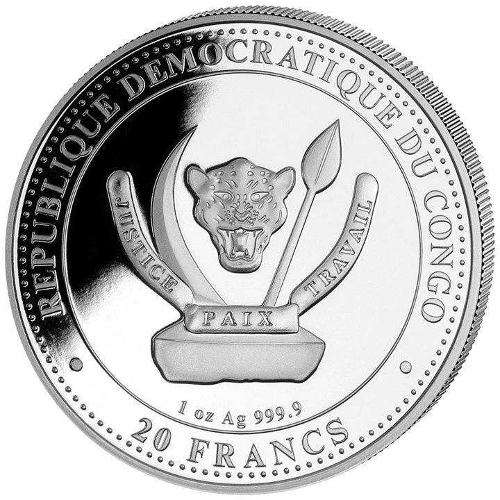Awers srebrnej monety przedstawia herb Republiki Konga oraz informacje o wartości nominalnej, wadze i próbie użytego kruszcu.