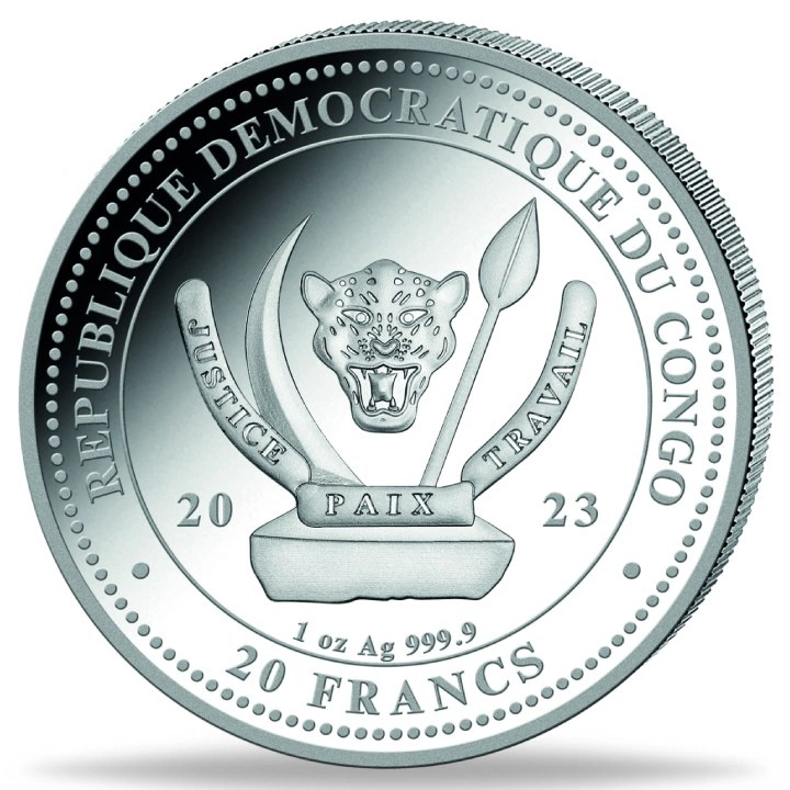 Awers srebrnej monety przedstawia herb Republiki Konga oraz informacje o roku wybicia, wartości nominalnej, wadze oraz próbie użytego kruszcu.