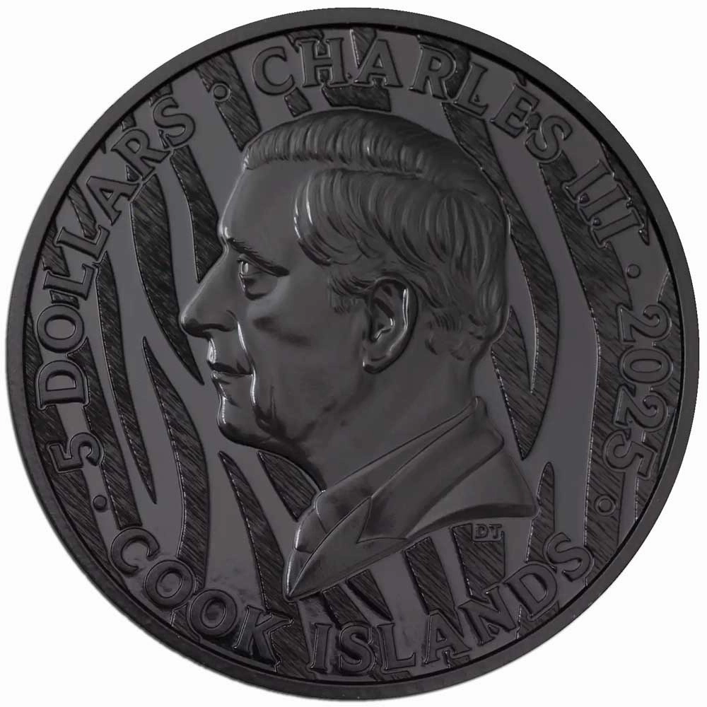 Awers przedstawia wizerunek Króla Karola III wraz z wartością nominalną $5, rokiem emisji 2025 oraz krajem emitenta Cook Islands. Kompozycja awersu utrzymana jest w klasycznym i eleganckim stylu menniczym, charakterystycznym dla serii Cook Islands.