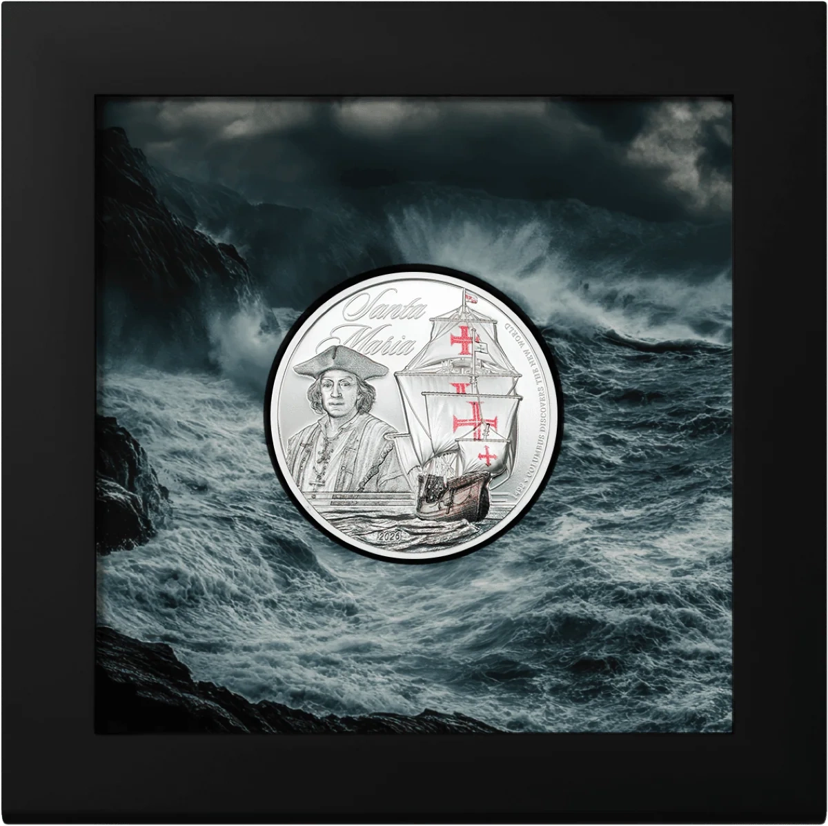 Cook Islands: Legends of the Seas – Santa Maria kolorowany 1 uncja Srebra 2026 Proof to pierwsza moneta otwierająca prestiżową serię Legends of the Seas, poświęconą najsłynniejszym okrętom w dziejach oraz ich kapitanom, którzy dzięki swoim wyprawom przeszli do historii. Niniejsza emisja upamiętnia Santa Marię – okręt, na którym Krzysztof Kolumb w 1492 roku przepłynął Ocean Atlantycki, rozpoczynając epokę wielkich odkryć geograficznych.