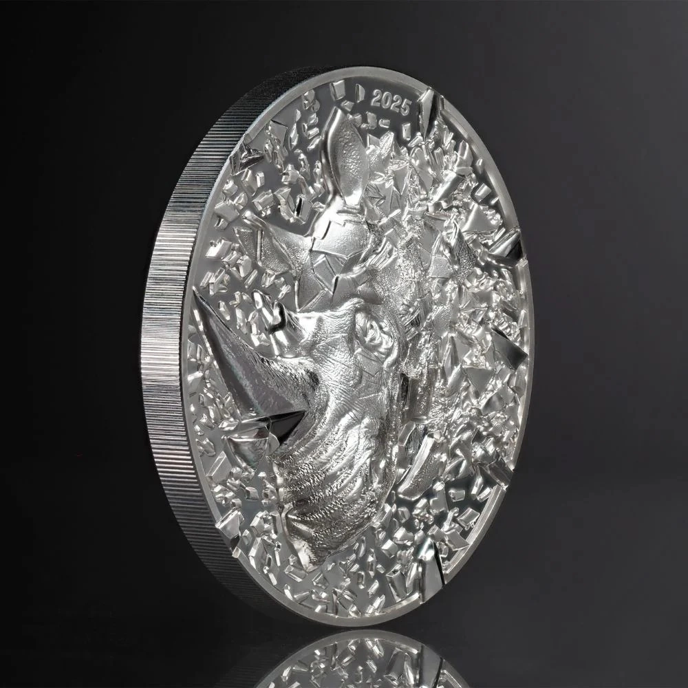 Moneta waży 3 uncje srebra próby 0,9999, ma średnicę 50 mm i została wybita w jakości Proof. Dzięki zaawansowanej technologii smartminting każdy detal nosorożca jest odwzorowany z niezwykłą precyzją – od wyrazistych oczu po szorstką fakturę skóry. Fragmentowane tło rozciąga się aż do krawędzi monety, a kontrastujące polerowane i ciemne powierzchnie podkreślają głębię i realizm projektu. Moneta dostarczana jest w eleganckim etui wraz z Certyfikatem Autentyczności, a emisja jest limitowana do 999 sztuk na świecie.