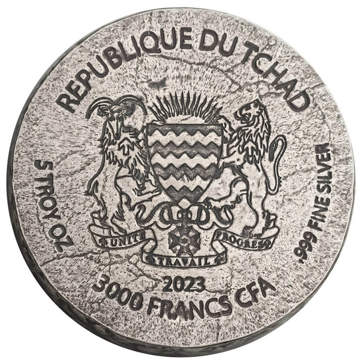 Moneta została wybita z czystego srebra próby Ag.999, o wadze 5 uncji trojańskich i średnicy wynoszącej 41 mm, z wykończeniem w stylu antiqued i ręcznie wykończonymi, chropowatymi krawędziami przypominającymi postarzany granit. Moneta wyprodukowana przez mennicę Scottsdale Mint posiada gwarancję rządu Republiki Czadu dotyczącą czystości kruszcu, legalności oraz pochodzenia metalu. Walor jest pełnoprawnym środkiem płatniczym na terenie kraju emitenta, co podkreśla jego wartość kolekcjonerską.