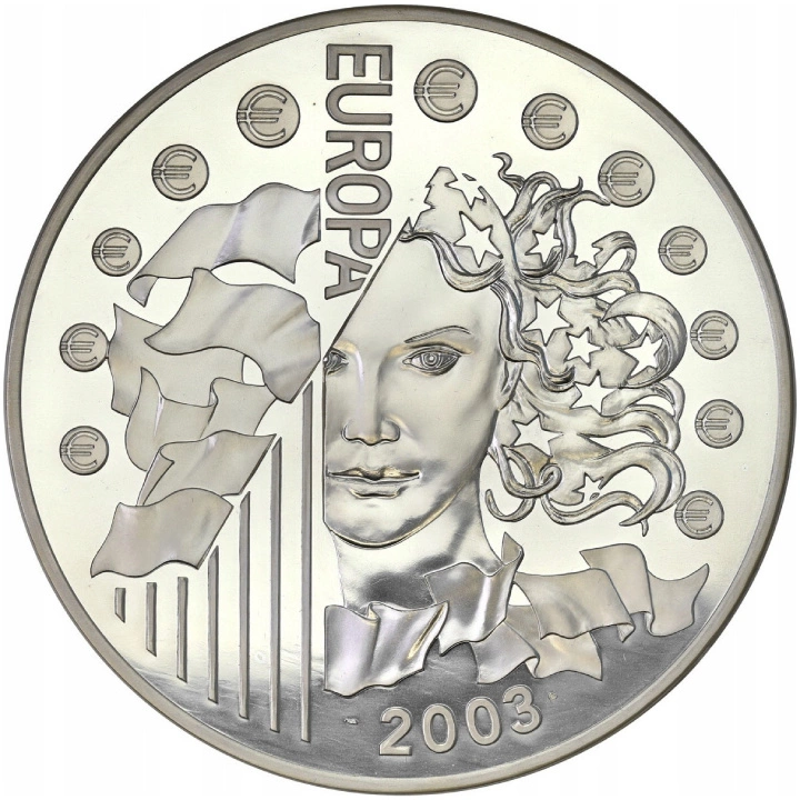 Francja: 1 rocznica "Euro" 1000 gramów Srebra 2003 Proof to walor, który świętuje pierwszą rocznicę wprowadzenia Euro.