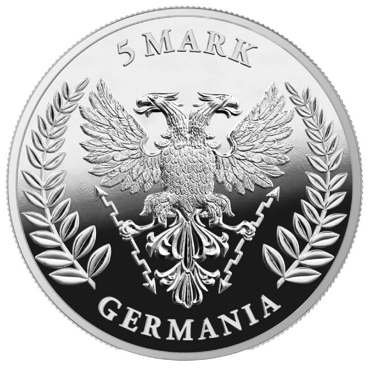 Rewers srebrnej monety zdobi Germania z tarczą i mieczem oraz z dwugłowym orłem. Na rewersie znajduje się napis "GERMANIA" oraz informacja o wadze, czystości kruszcu oraz roku bicia waloru.