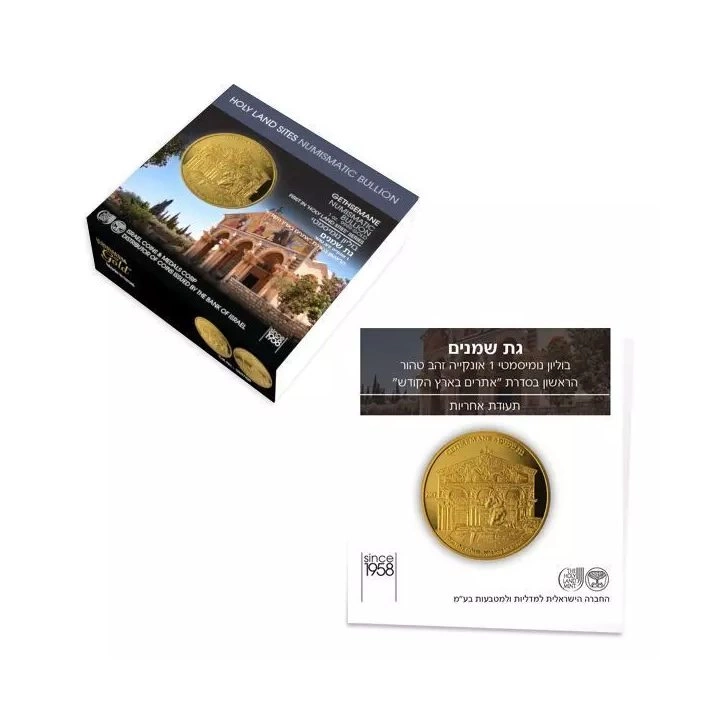 Awers ukazuje Jezusa modlącego się przy Kościele Wszystkich Narodów i napis "GETHSEMANE". Na awersie umieszczono informacje o roku, czystości i wadze kruszcu zapisane po hebrajsku, angielsku.