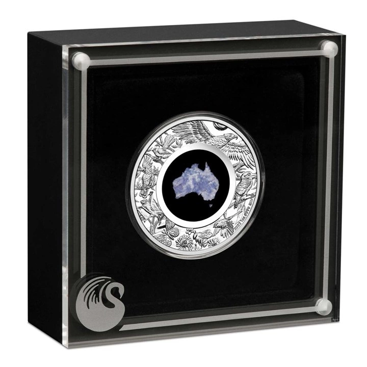 Srebrna moneta Great Southern Land 1 uncja Srebra 2022 Proof (Moneta z niebieskim lepidolitem) to wyjątkowy produkt, który jest bity lustrzanym stemplem w standardzie proof. Wyjątkowości dodaje zaprezentowanie kontynentu Australii, który został wykonany za cennego oraz rzadkiego minerału jakim jest niebieski lepidolit.