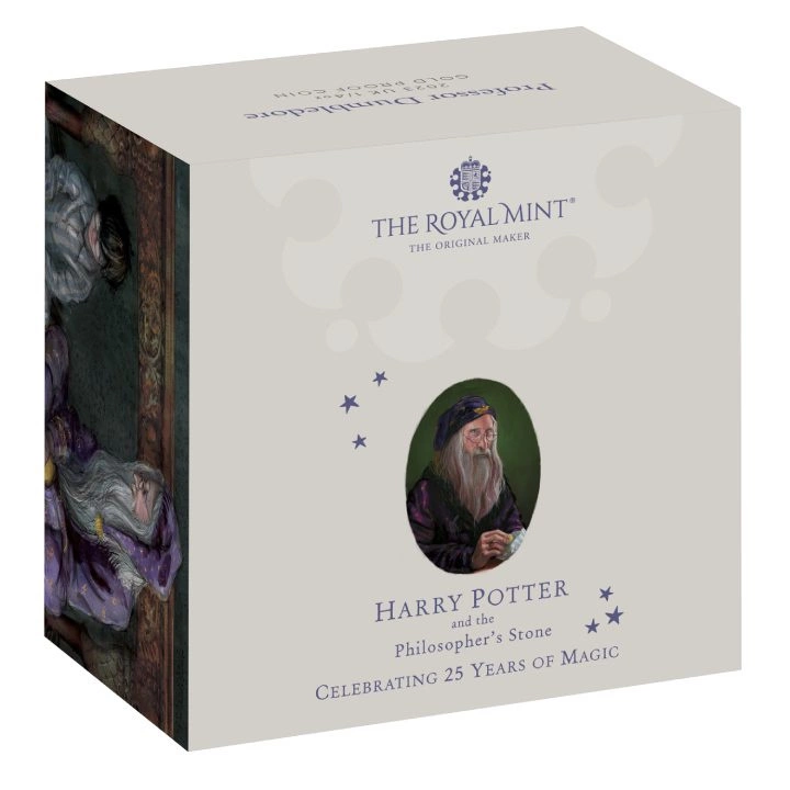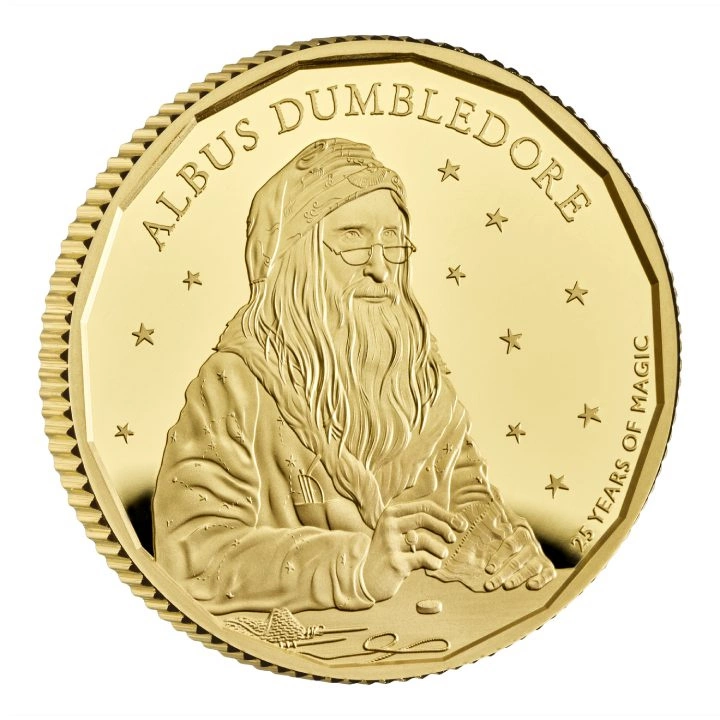 Harry Potter: Albus Dumbledore 1/4 uncji Złota 2023 Proof to unikatowy walor nawiązujący do pierwszego wydania tomu "Harry Pottera i Kamień Filozoficzny", który miał światową premierę 26 czerwca 1997 na terenie Wielkiej Brytanii. W 2022 roku książka świętowała 25. rocznicę i jest pierwszą częścią siedmiotomowej serii powieści, gdzie głównym bohaterem jest Harry Potter, stawiający czoła napotkanemu złu w świecie czarodziejów. Jest to trzecia moneta z serii "Harry Potter 25th Anniversary".