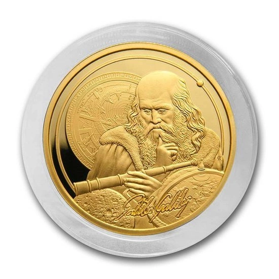 Pierwsza moneta z tej serii Icons of Inspiration, ta złota moneta ma elegancki wzór ku czci Galileo Galilei, słynnego naukowca XVI wieku. Grafika autorstwa słynnego projektanta monet Joela Iskowitza to elegancki hołd dla tego naukowego innowatora.