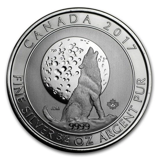 Na rewersie monety został przedstawiony wizerunek wilka, a także próba w jakiej została wybita moneta (Ag .9999), rok bicia (2017), waga (3/4 Uncji Srebra), Stop(0.999) oraz nazwa kraju (Canada), w którym jest produkowana.
