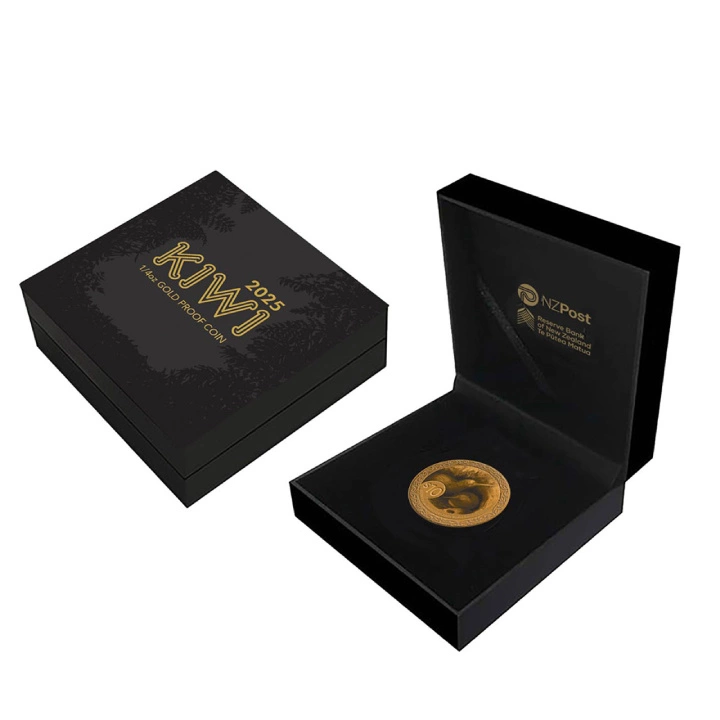 Kolekcjonerski numizmat Kiwi 1/4 uncji Złota 2025 Proof to niezwykle ceniona moneta będąca częścią emitowanej od 2004 roku limitowanej serii Kiwi. Produkt z 2025 roku przedstawia parę kiwi z gatunku - "Apteryx rowi "wraz z ich jajem, co odzwierciedla unikalne cechy tego gatunku, jak współdzielenie opieki nad potomstwem przez samca i samicę. Pisklęta często pozostają w rodzinnej grupie przez kilka lat. Moneta ozdobiona jest również tradycyjnym wzorem kowhaiwhai, podkreślającym związek ludu iwi z rowi. Wzór ten został podarowany przez Fayne'a Robinsona z Te Rūnanga o Makaawhio.