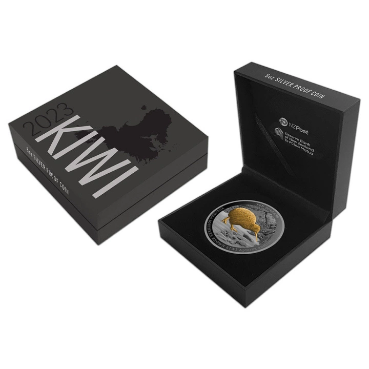 Kolekcjonerski numizmat Kiwi pozłacany 5 uncji Srebra 2023 Black Proof to wyjątkowa moneta pochodząca z emitowanej od 2004 roku limitowanej serii Kiwi. Produkt z 2023 roku przedstawia kiwi południowego z rodziny "Apteryx australis". Ten gatunek występujący m.in na Wyspie Stewart, Fiordland. Charakteryzuje się szarobrązowym upierzeniem z podłużnymi prążkowanymi piórami.