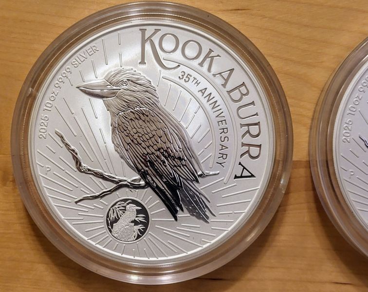 Srebrna moneta Kookaburra z roku 2025 świętuje 35. rocznicę jednej z najpopularniejszej bulionowej serii, Australian Kookaburra. Początkowo (nie licząc pierwszego wydania, które wybito tylko w jednej gramaturze – 1 uncja), kolekcję bito w czterech różnych rozmiarach: 1 kilogram, 10 uncji, 2 uncje, 1 uncja, natomiast w roku 2010 ograniczono ilość do 3 rozmiarów: 1 kilogram, 10 uncji oraz 1 uncja.
