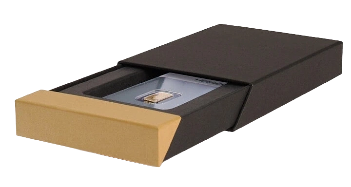 Pudełko nie tylko zapewnia bezpieczne przechowywanie, ale także dodaje prestiżu do każdej sztabce złota. Wykonane z papieru, etui jest przyjazne dla środowiska, jednocześnie zachowując wyjątkowy wygląd i trwałość.