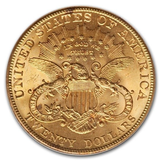 Rewers zawiera wizerunek heraldycznego orła z tarczą na piersi. Powyżej widnieje, otoczony przez 13 gwiazd, napis IN GOD WE TRUST. W okół całości rozciąga się napis UNITED STATES OF AMERICA oraz nominał monety " TWENTY DOLLARS." Wizerunek rewersu został zaprojektowany przez Jamesa B. Longacre'a oraz był bity w latach 1850-1907.